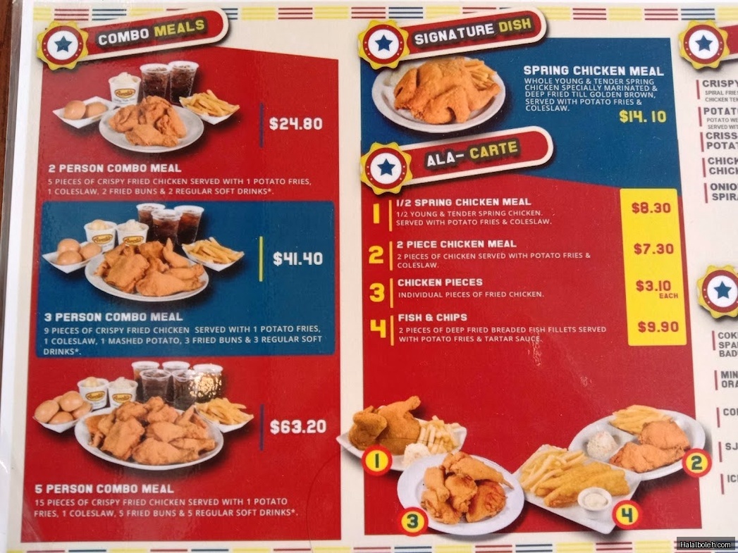 The restaurant is renowned for its signature Spring Chicken - a whole chicken marinated and fried to golden perfection with crispy skin and tender, juicy meat inside. Their menu features crispy chicken tenders made from boneless marinated chicken breast, combo meals with sides like spiral fries and coleslaw, and unique local beverages including iced bandung and iced Milo.