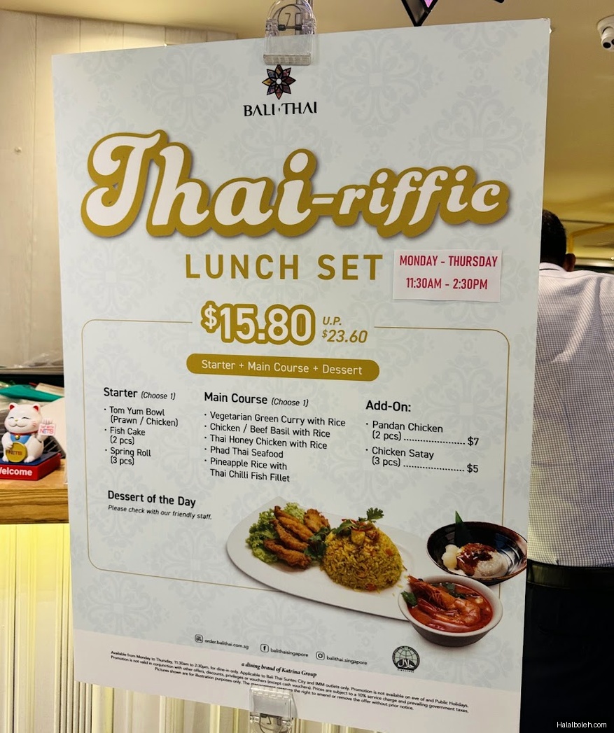Good ambience, attentive service, and responsive staff. It's spacious with large tables for 8-10 people, making it suitable for office team lunches. Chris shared information on savings when buying Bali Thai's cash vouchers and encouraged further savings. Impressive knowledge and service. Highly recommended. The food is delicious and yummy. Vegetarian dishes are also available, making it inclusive.