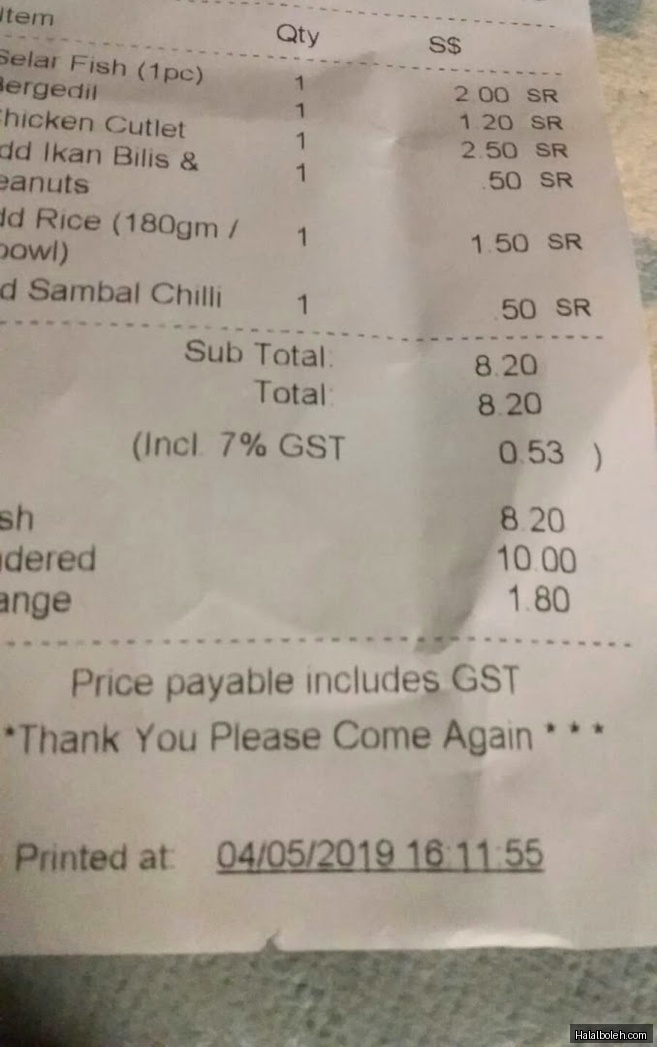Bought a pack of their Nasi Lemak Royale for $8.30. The Nasi Lemak Royale was as shown on the picture of the receipt with the time stamp. I scooped out everything onto a bowl to show the serving, as it could hardly be seen in the packaging itself.