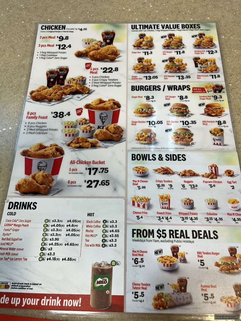 The extensive menu at KFC Singapore goes far beyond their signature fried chicken, offering a comprehensive selection that includes Zinger burgers for spice lovers, wraps for on-the-go convenience, and a variety of sides like cheese fries and whipped potatoes. Their breakfast menu (AM menu) is available at selected locations, while special promotions like "Chicken Tuesday – 5 pcs for $9.95 only!" provide excellent value for families and groups. The menu balances international KFC standards with local preferences, ensuring that every visit delivers the familiar comfort food experience that customers expect from this global brand.