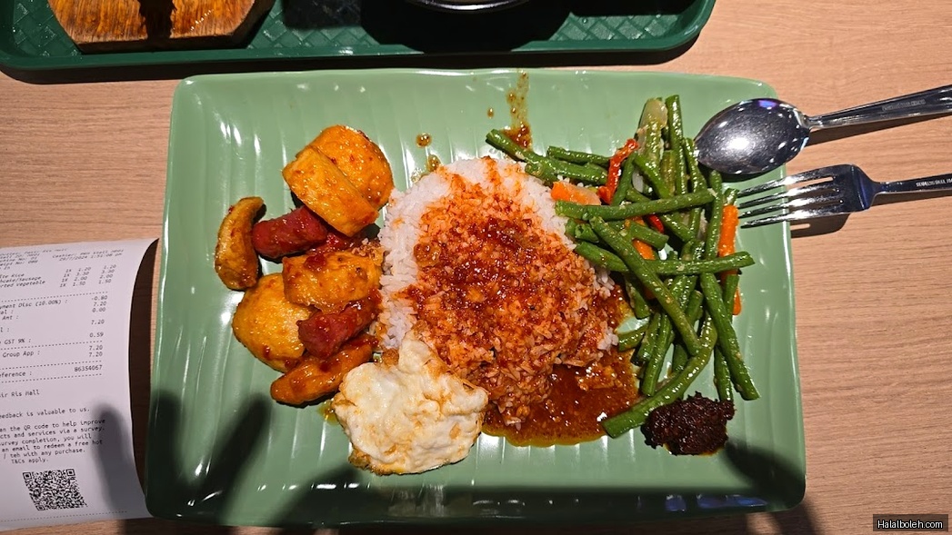 First time trying this restaurant, located in the food court of Pasir Ris Mall. For Malay mixed rice, $12 is relatively expensive. I ordered yellow curry rice with mutton, an egg prata, and vegetables. I liked the yellow curry rice, and the mutton was decent too, but the prata was overcooked.