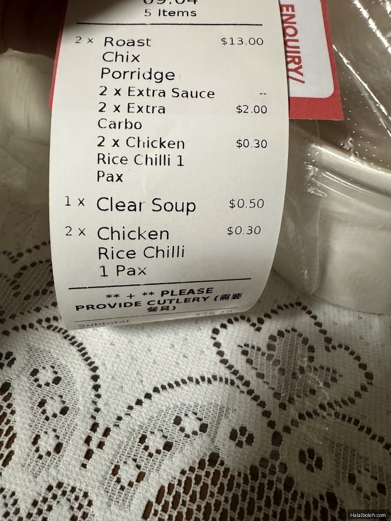 Ordered from this outlet on 10/7/25 at around 8 PM. I asked for 2 steam chicken porridge, but what I received literally looked like rice and soup. It was also quite bland. Bad job.
