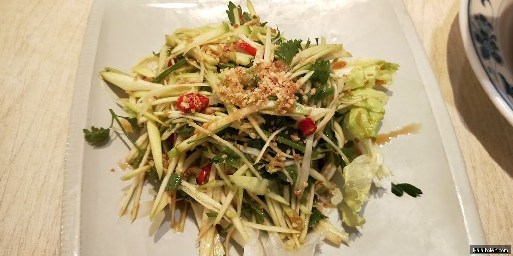 Unlike northern cuisine which uses vinegar in sweet and sour dishes, Thai cuisine uses lemon. One of the best local dishes is the lemon tofu. It's tender inside and crispy outside, with perfect cooking timing. Unlike hawker style, they use small pieces of tofu. The green mango side dish also matches perfectly.