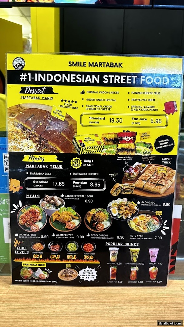 The place is quite small, so even a group of 4 will find it difficult to sit at the same table. The food is so-so. The geprek coating is like KFC type, not Indonesian style. The nasi lemak is soft and sticky. The baso beehoon is okay. The chocolate martabak's filling is very thin (not sure about the taste, I didn't try it) and doesn't look buttery. The beef martabak is so-so, with very little sauce. It's overpriced for me.